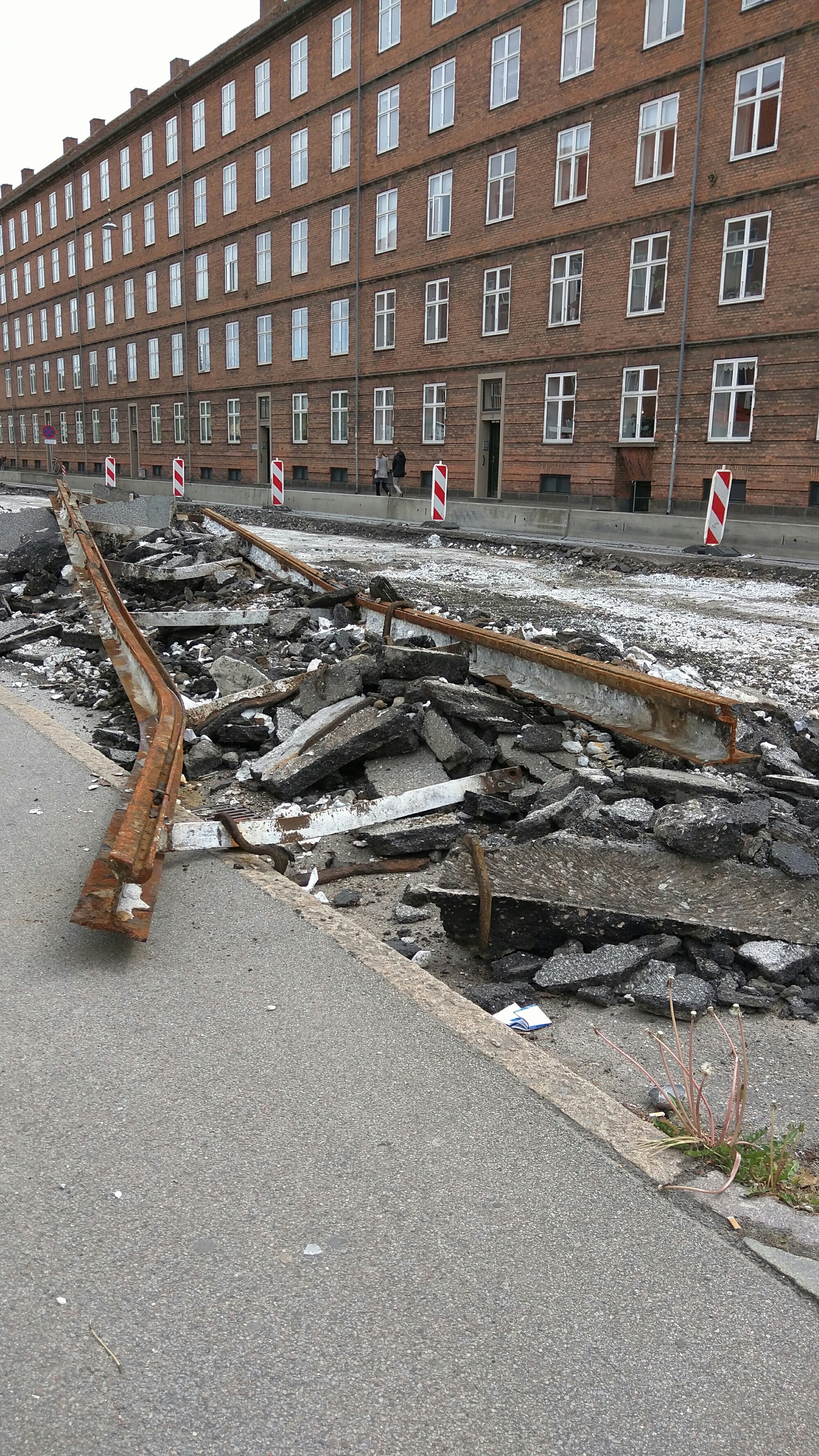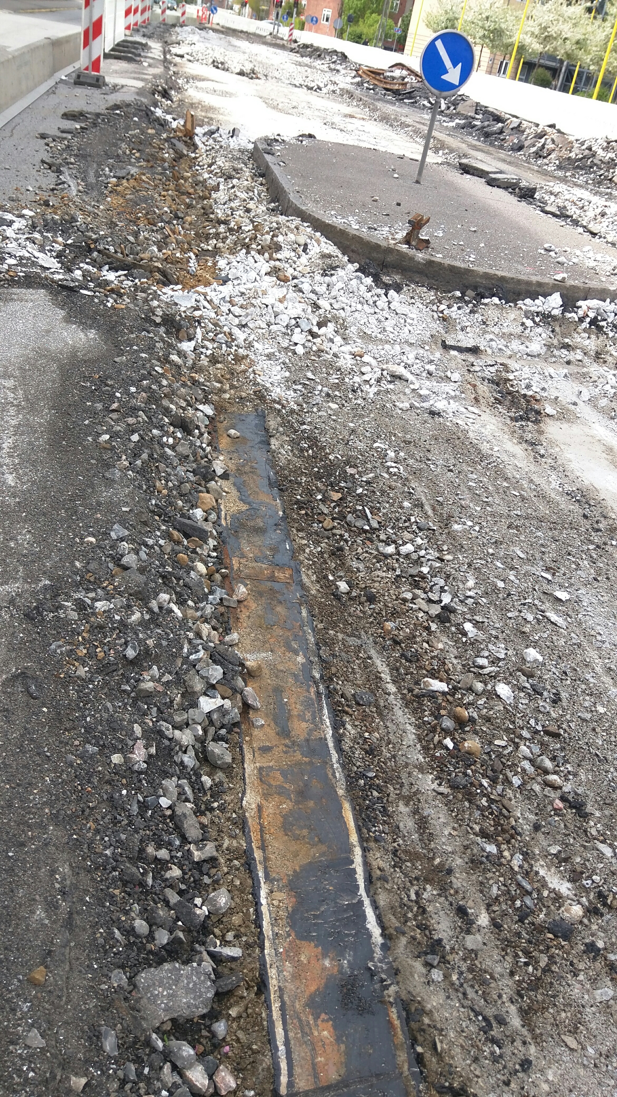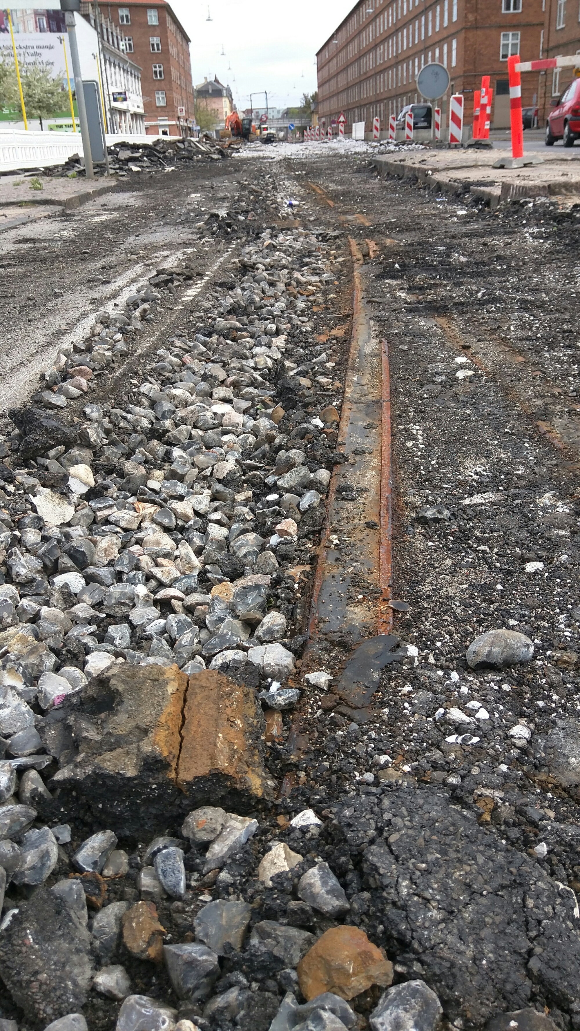Ca 15 centimeter nede, ligger fortiden i form af forbavsende velbevarede skinner fra fordums sporvogne, de er en lille smule rustne men i fin, næsten brugbar stand, i hverfald ind til gravemaskinerne har haft fat i dem.