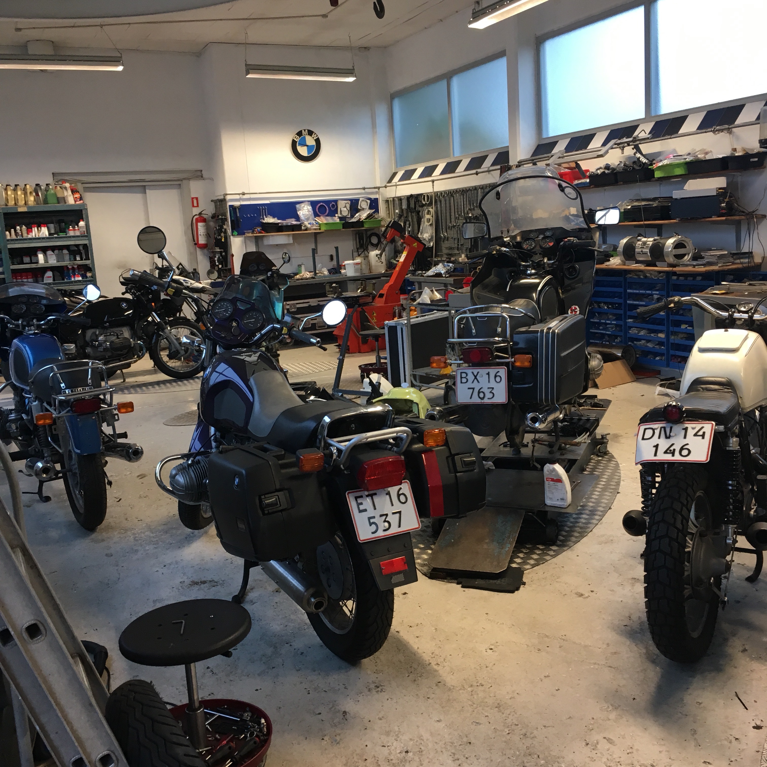 Frk Bimmer på besøg hos Jes – ny ventilløfter nødvendig – hun lyder som en cykel med et stykke pap, sat fast med en tøjklemme i baghjulet, sådan som man lavede motorcykellyde ud af ingenting, da jeg var barn og det er egentlig hyggeligt med den lyd men det er også IRRITERENDE og forkert og udstødningen er iøvrigt ved at falde af – bolten er knækket – Jes har en ny og han skifter den flydende, roligt.
