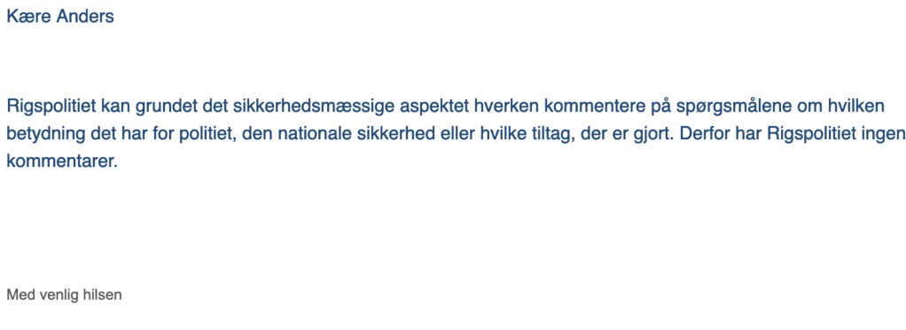 Jeg har selvfølgelig spurgt dansk politi om, hvad planen er nu, og svaret lød: ’Rigspolitiet kan grundet det sikkerhedsmæssige aspektet hverken kommentere på spørgsmålene om hvilken betydning det har for politiet, den nationale sikkerhed eller hvilke tiltag, der er gjort. Derfor har Rigspolitiet ingen kommentarer’