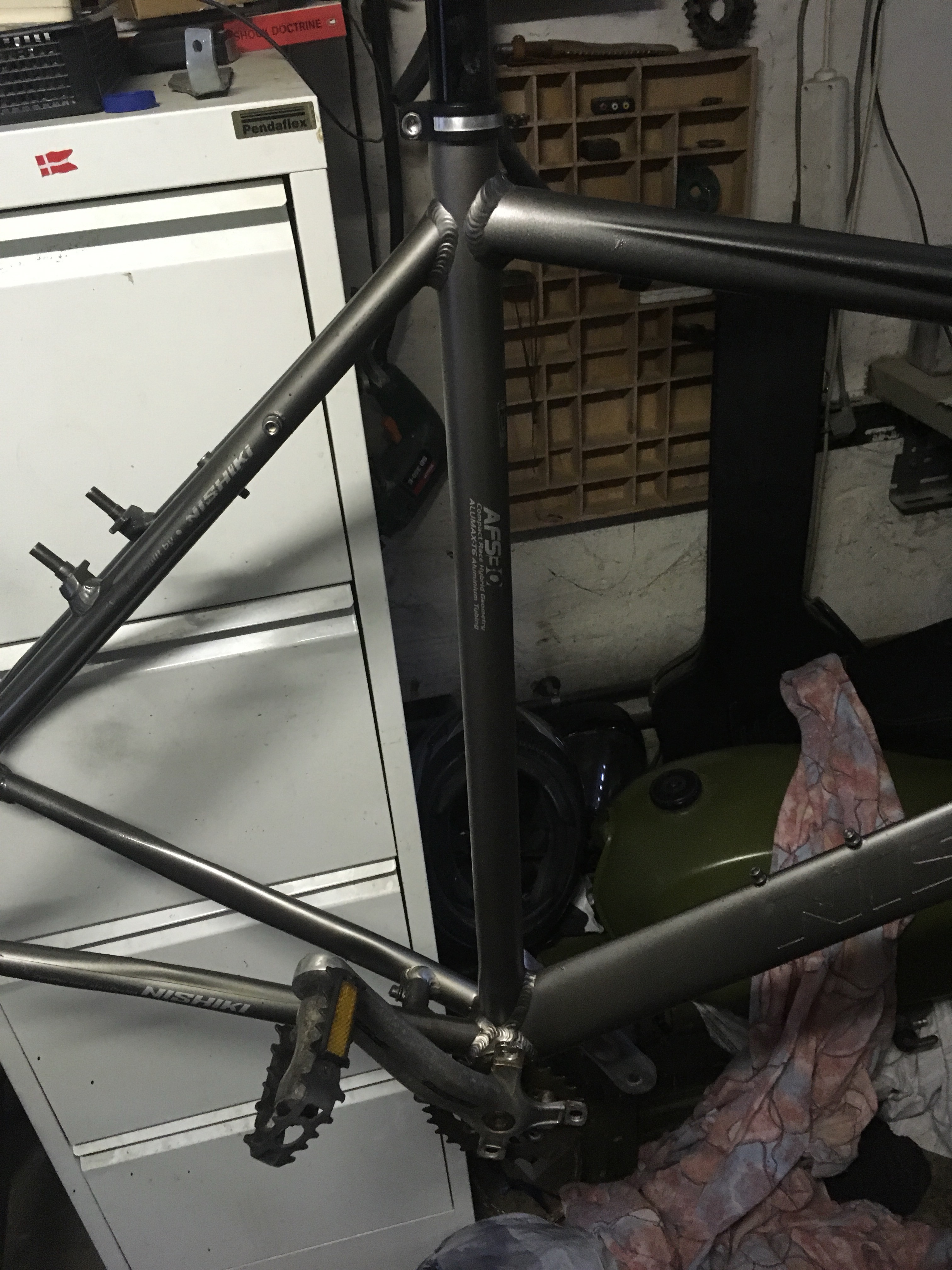 Brugt, meget brugt, nishiki købt på den blå af diskusprolapsramt ældre mand, der skrev den var i god mekanisk stand….jeg gav ham 700(80 kr ned – den trak til venstre – jeg troede det var kabler, der var forkert monterede…men nej), bare for hjul(der er lige) – resten har jeg nu splittet ad til atomer – og mekanisk stand var ikke “god”…