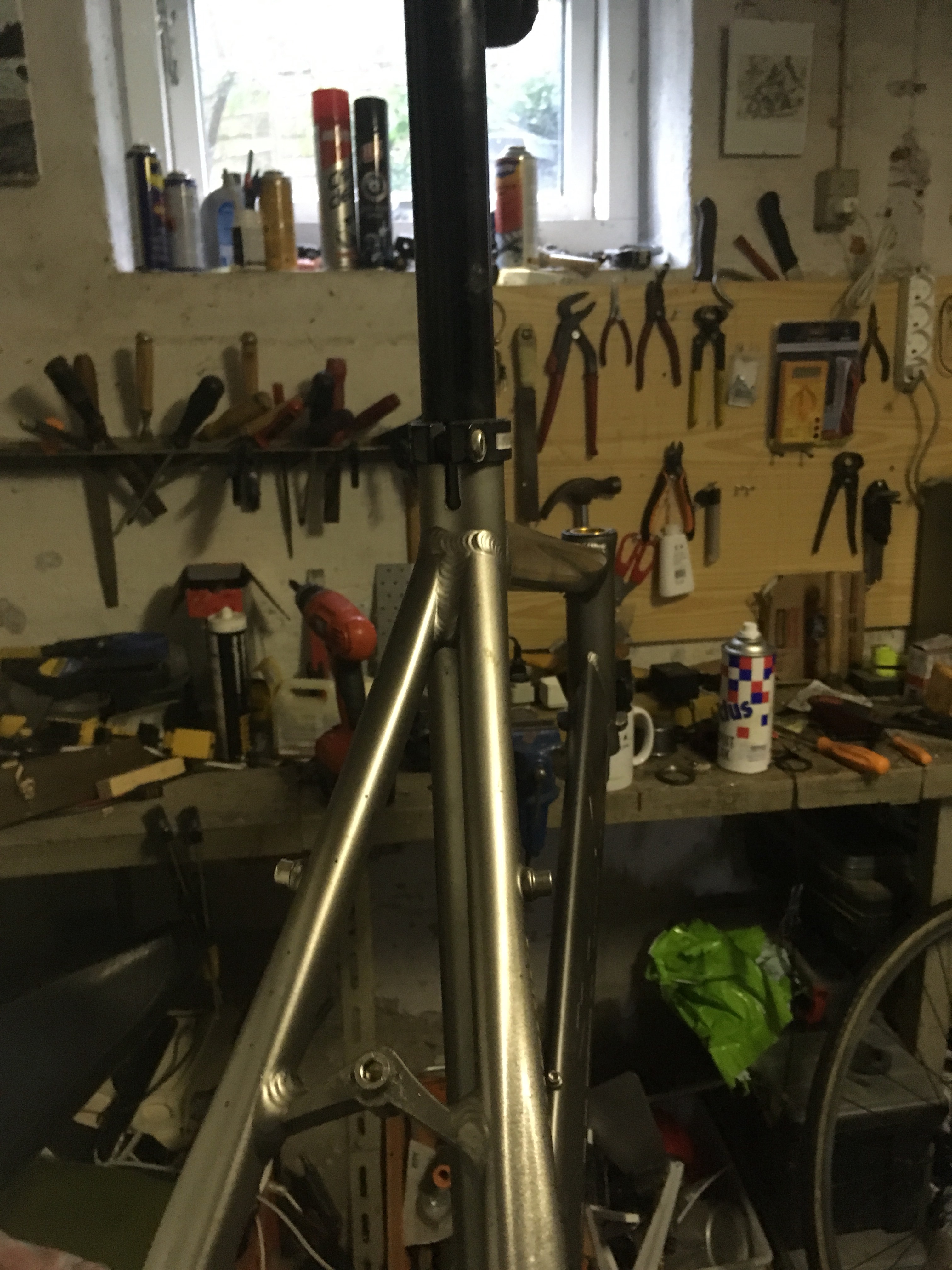 Men indtil videre har jeg skrællet den for ALT. Og været nød til at male alustel. Og købe: ny kæde, bagskifter, klinge, kabler – alt var rustet fast/spændt med trykluft og det har givet skrammer og sår på hænderne at få op igen – bliver spændende hvordan den er, når samlet: Skulle gerne ende med en single klinge foran og 8 gear bag…