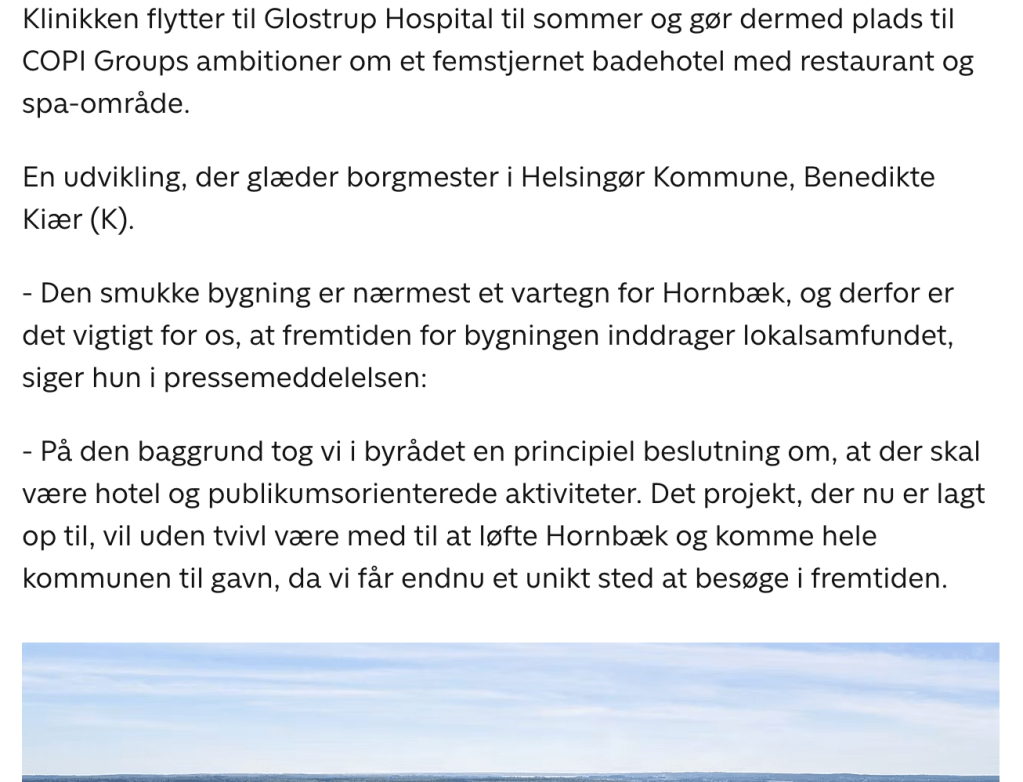 DE SVAGE OG DE SYGE KLARER SIG NOK UDEN UDSIGT? Skt. Hans Hospitalet ved Roskilde Fjord ligger et dejligt sted, med kort til vandet, store haver og rolige omgivelser. Det er så dejligt, at det selvfølgelig skal sælges til ejerlejligheder. Ligesom Psykiatrisk Hospital i Århus og sidst Hornbæk Hospital, hvor patienter med rygmarvsskader gennem 70 år har kunnet få behandling med udsigt over Kattegat. Det blev i april solgt til nogen developers der vil lave badehotel med spa under stor jubel fra statens ejendomsselskab, Freja og borgmesteren fordi regionen kan samle det hele i Glostrup…det er sikkert billigere, og hey, trafikofre og den slags kan vel godt klare sig et andet sted, der ikke kan sælges? Freja har p.t. 26 ejendomme til salg, det er ikke hospitaler alle sammen, men når man sidder og bladrer dem igennem, får jeg altså følelsen af brandudsalg af en hel nation og alt det vores forfædre arbejdede på at bygge op? Jeg kan ikke lade være med at tænke, at vores medfølelse og omsorg for hinanden er blevet erstattet af iskold rationalisering og simpel kynisme for profit. Og at de mennesker, der i sin tid stod bag byggerierne og de smukke steder, var bedre mennesker, end dem vi er nu. Men det er nok bare mig, der synes det er logisk at ville give syge mennesker smukke omgivelser? For ingen spørger tilsyneladende ind til det men dyrker i stedet udsalgets beruselse…